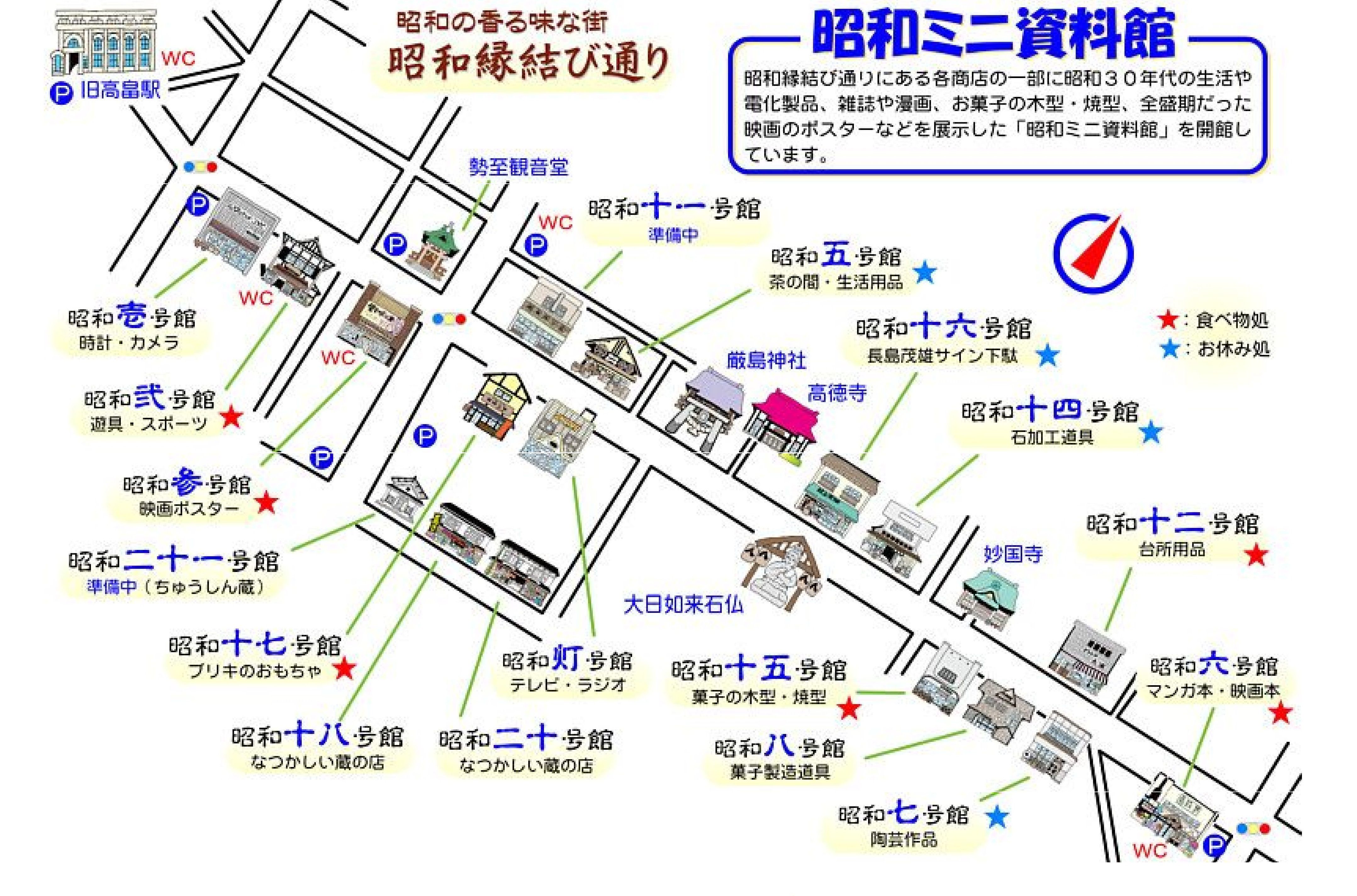 すばらしいご縁が結ばれて、素敵な出会いがあるようにと名付けられた「昭和縁結び通り」では、約1劼猟未蠢澗里鮠赦30年代の雰囲気を演出した資料館として公開している。当時の生活用品や電化製品、雑誌やマンガを展示するほか、学校教室や茶の間を再現したスペースもあり、商店街を楽しく散策できる。展示店はユニークな手製の看板が目印。